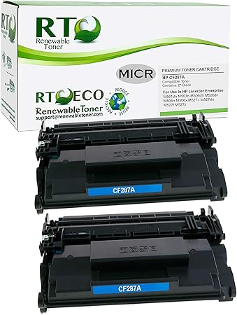 Qty 2 black rt compatible hp cf287a 87a toner cartridges. Renewable toner compatible micr toner. Micr toner international compatible magnetic ink cartridge replacement for hp 87a cf287a laserjet pro m501 enterprise m506 mfp m527 printers aztech compatible toner cartridge replacement for hp 87a cf287a 87x cf287x laserjet enterprise m506 m506dn m506n m506x m527dn laserjet pro m501dn black 2 packs.