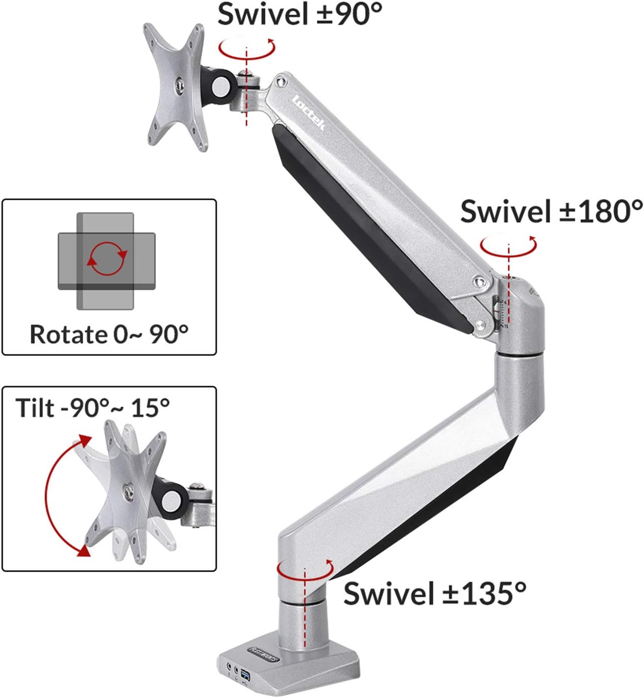 The loctek d7 desk mount monitor arm is easily adjusted allowing you to effortlessly work in a more ergonomic and healthy posture and avoid neck and back pain associated with desk hunch this high performance monitor mount offers a wide range of features including ports for audio mic and usb devices. Make sure your monitor s vesa holes measure 100x100mm or 75x75mm gas spring. Sit more comfortably at your desk while reducing neck eye and back strain extend or retract monitor arm.